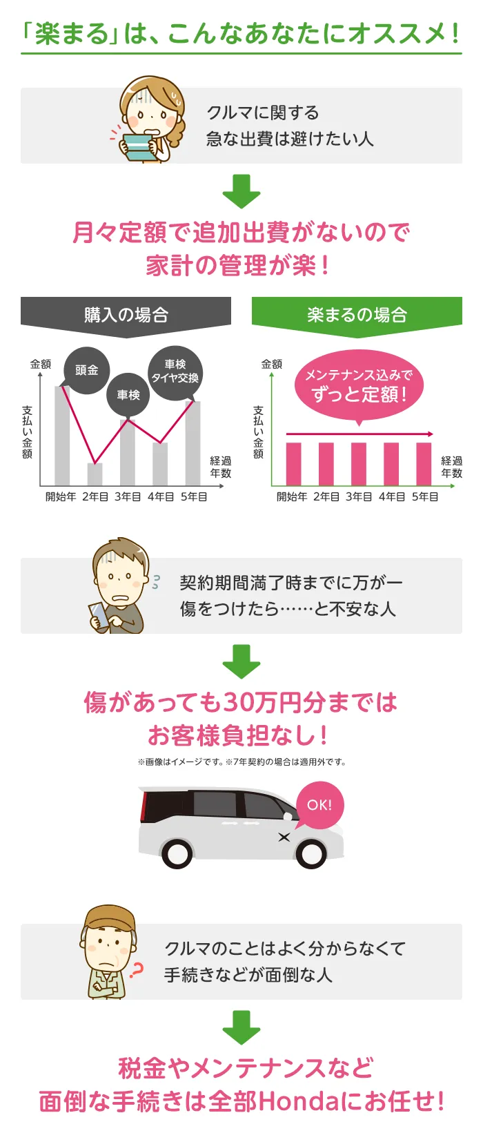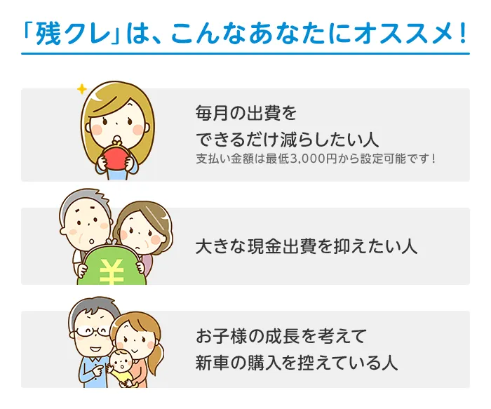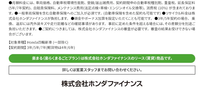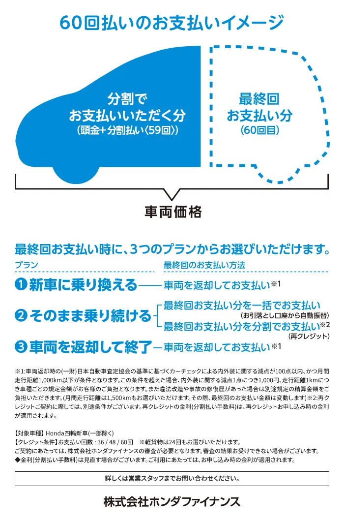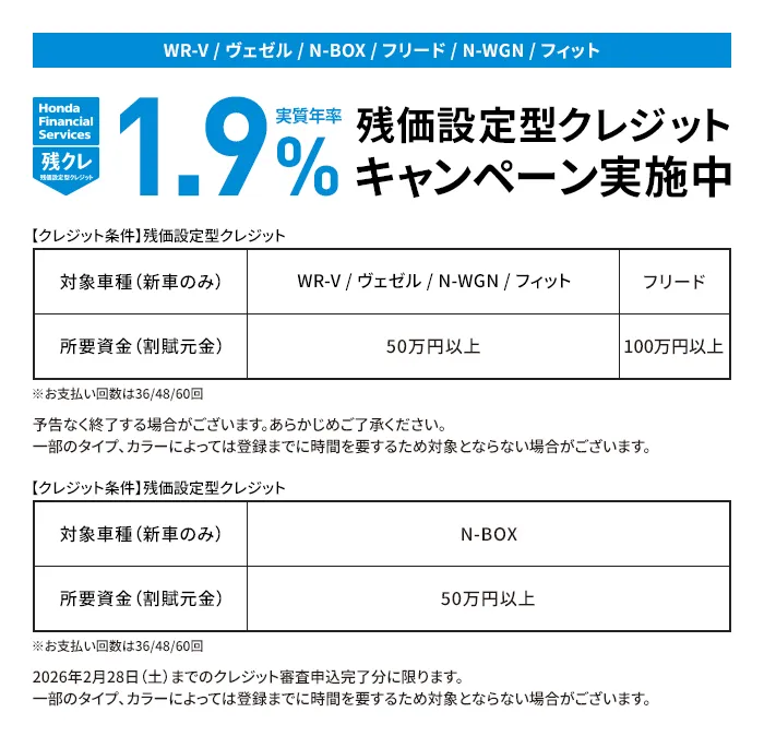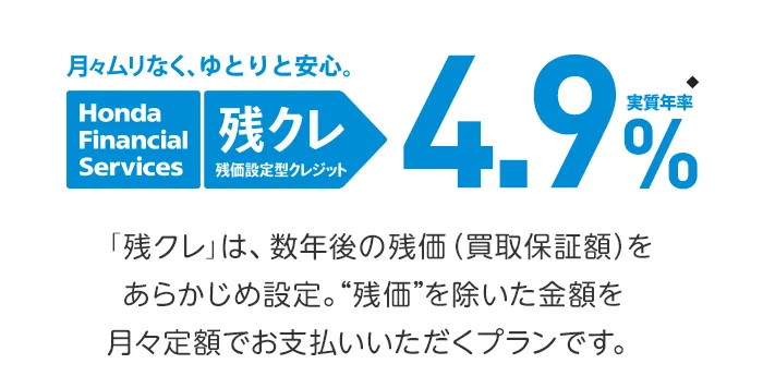(残価設定型クレジットのお支払い例について)・上記お支払い例は2026年1月の一例です。・上記お支払い例は、初回お支払い月を2026年3月、初回ボーナス月を2026年7月(以下ボーナス月は1月・7月)で計算した一例です。※本クレジットは最終回に、@新車に乗り換えA乗り続ける(最終回お支払い額を一括または再クレジットでお支払い)B車両を返却 のいずれかをお選びいただけます。@、Bの場合、内外装キズや走行距離などの確認事項があります。事前に定めた条件を超える場合には、その差額分を別途ご負担いただきます。詳しくは営業スタッフまでお問い合わせください。